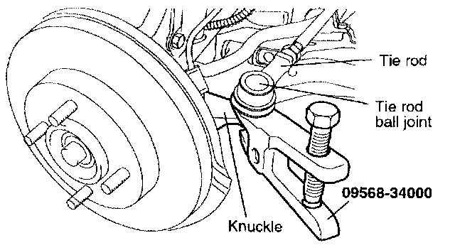 3. Disconnect the tie rod end ball joint from the knuckle by using the Special Tool (09568 - 34000).