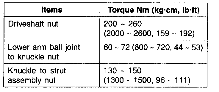 Specified torque Nm (kg~cm, flab): 200 ± 260 (2000 ± 2600, 159 ± 192)