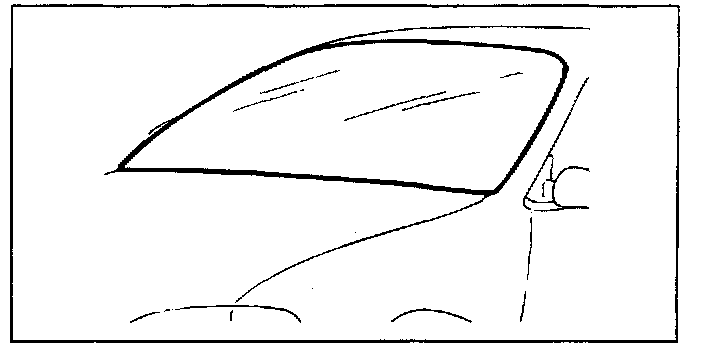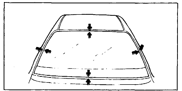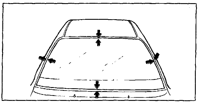 3. Center the new windshield glass in the opening. Mark the location by scribing lines across the glass and body with a grease pencil at the four points as shown.