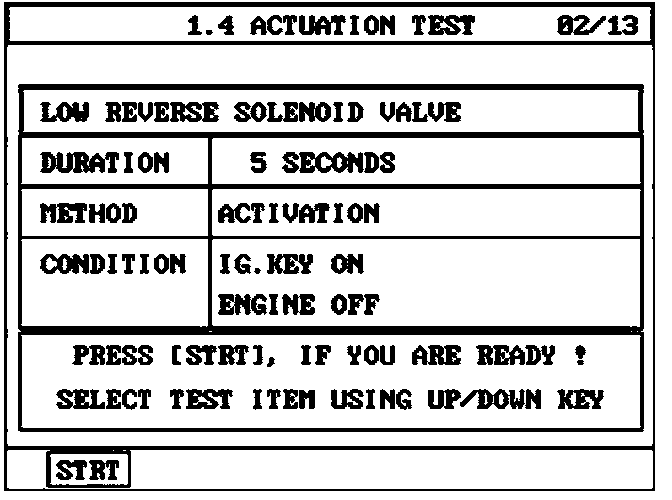 ^ Press the F1 button (STRI) and test the LR, UD, 2ND, OD, DCC and FSV solenoid (if applicable). Monitor the Hi-Scan and listen for a solenoid sound from the engine compartment.