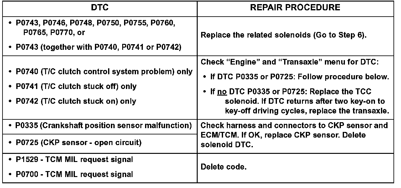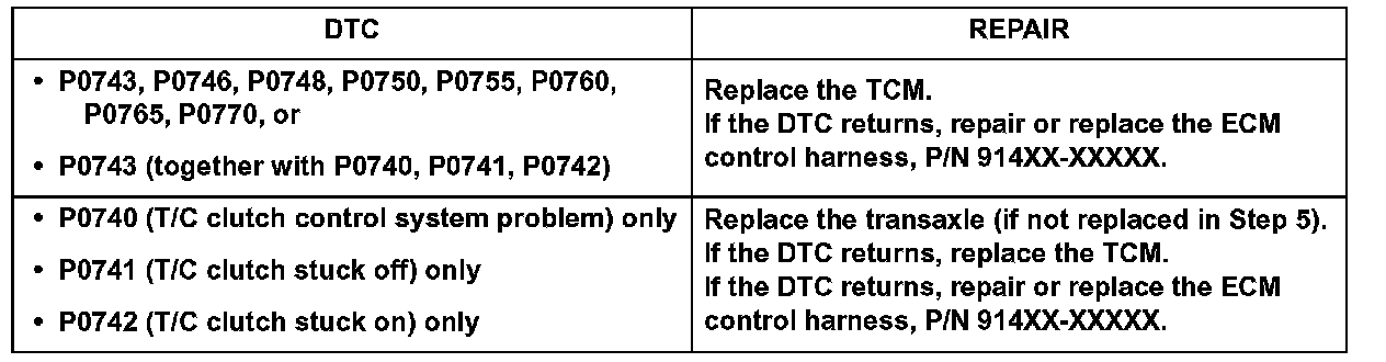 13. Clear the codes and test drive the vehicle for two driving cycles (two key-on to key-off driving cycles, including 1-2-3-4 upshifts and 4-3-2-1 downshifts). If the DTC returns, perform the repairs shown.