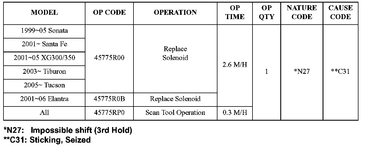 10. Refer to the DTC recorded in Step 1 and replace the related solenoid according to the diagram shown. Tighten the bolts to 4-5 lb.ft (50-70 kg.cm). Go to Step 11.