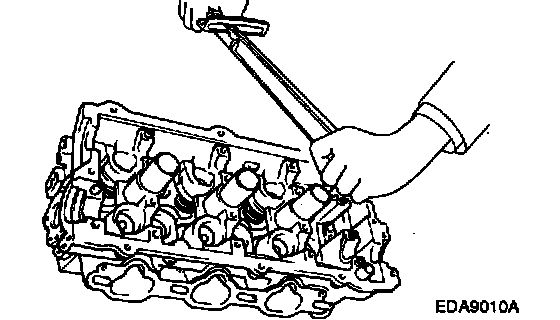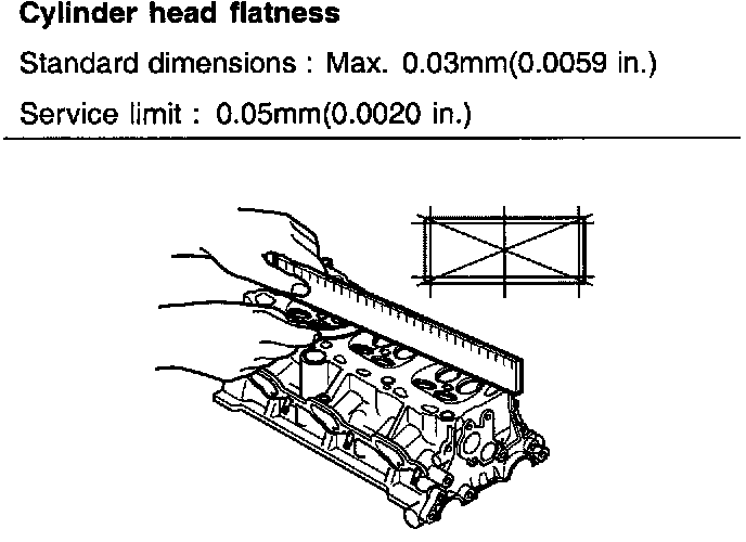 3. Check the cylinder head surface for flatness with a straight edge and feeler gauge as shown in the illustration.
