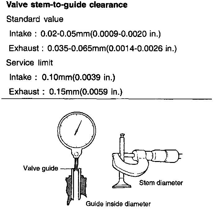 Check the valve stem-to-guide clearance. If the clearance exceeds the service limit, replace the valve guide with a new oversize guide.
