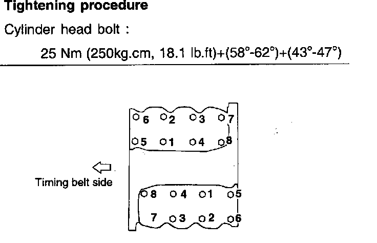 Cylinder head bolt: 25 Nm (250 kg.cm, 18.1 ft. lbs.) + (58° - 62°) + (43° - 47°)