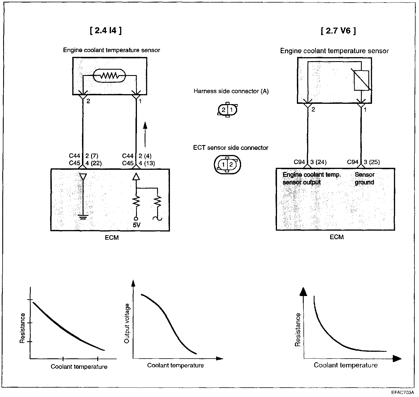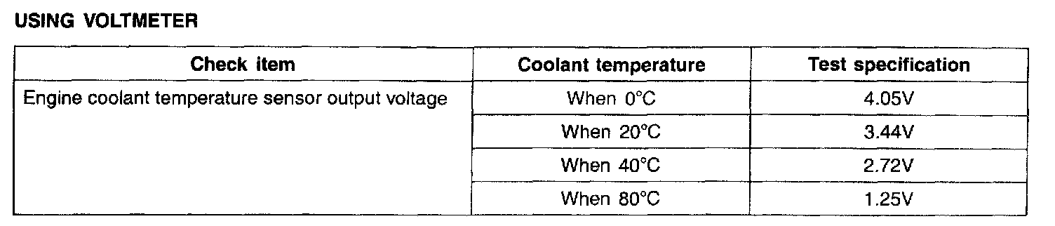 ENGINE COOLANT TEMPERATURE (ECT) SENSORThe engine coolant temperature sensor installed in the engine coolant passage of the cylinder head detects the engine coolant temperature and emits signals to the ECM. This part employs a thermistor which is sensitive to changes in temperature. The electric resistance of the thermistor decreases in response to a temperature rise. The ECM determines engine coolant temperature by the sensor output voltage and provides optimum fuel enrichment when the engine is cold.