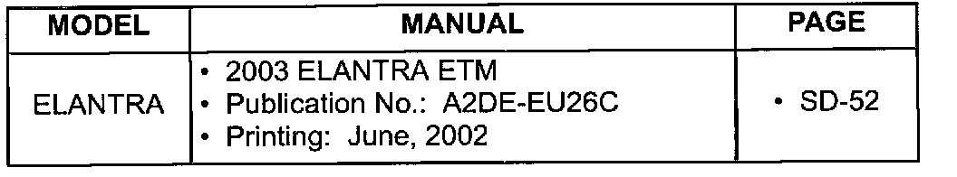 Shown is a revised page for the 2003 MY ELANTRA Electrical Troubleshooting Manual (ETM) that has been updated for the following reason: