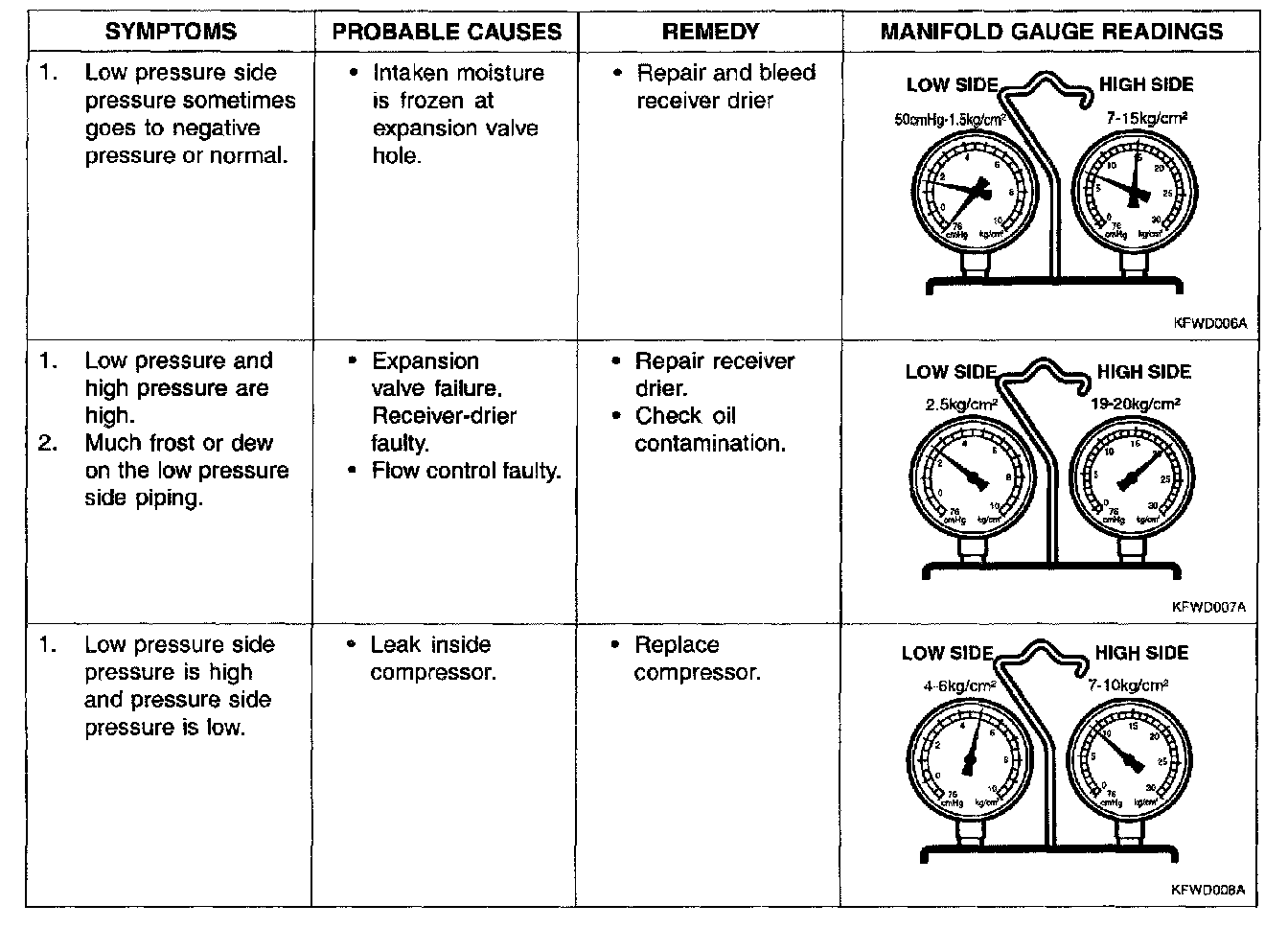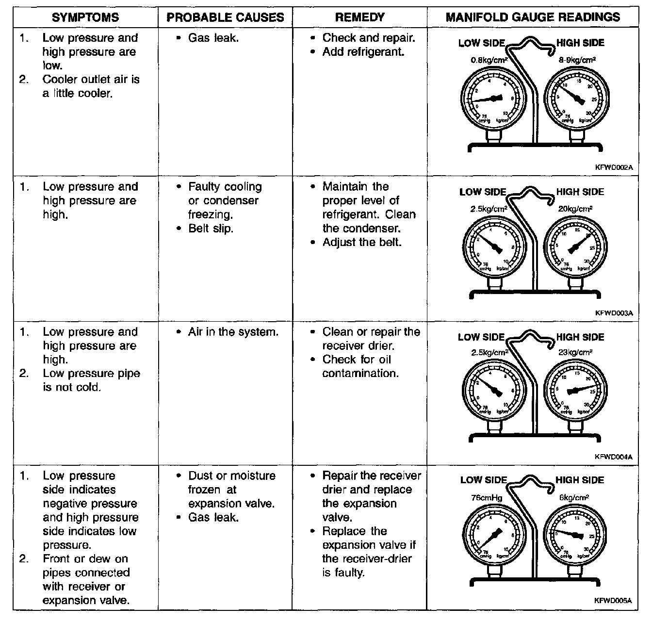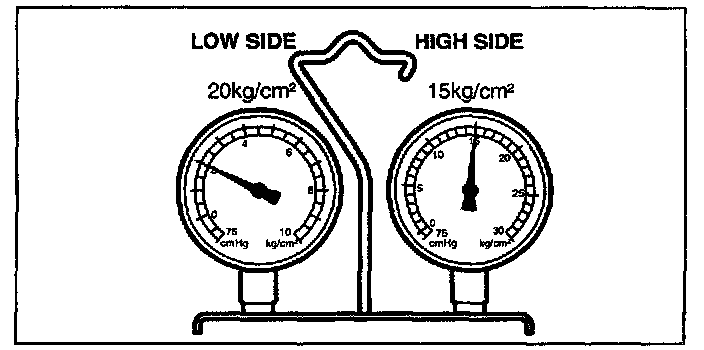 If cooling cycle is operating normally, the manifold gauge reading will be approx. 1.5-2.0 kg/sq.cm for the low pressure side and approx. 14.5-1 5kg/sq.cm for the high pressure side. Inlet temperature should be 30-35 °C, with the engine at 2,000 rpm, maximum cooling selected, and the blower on highest level.