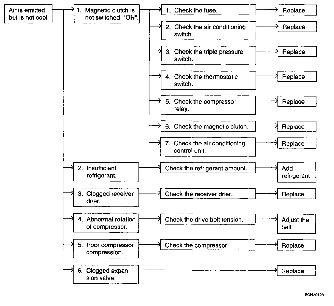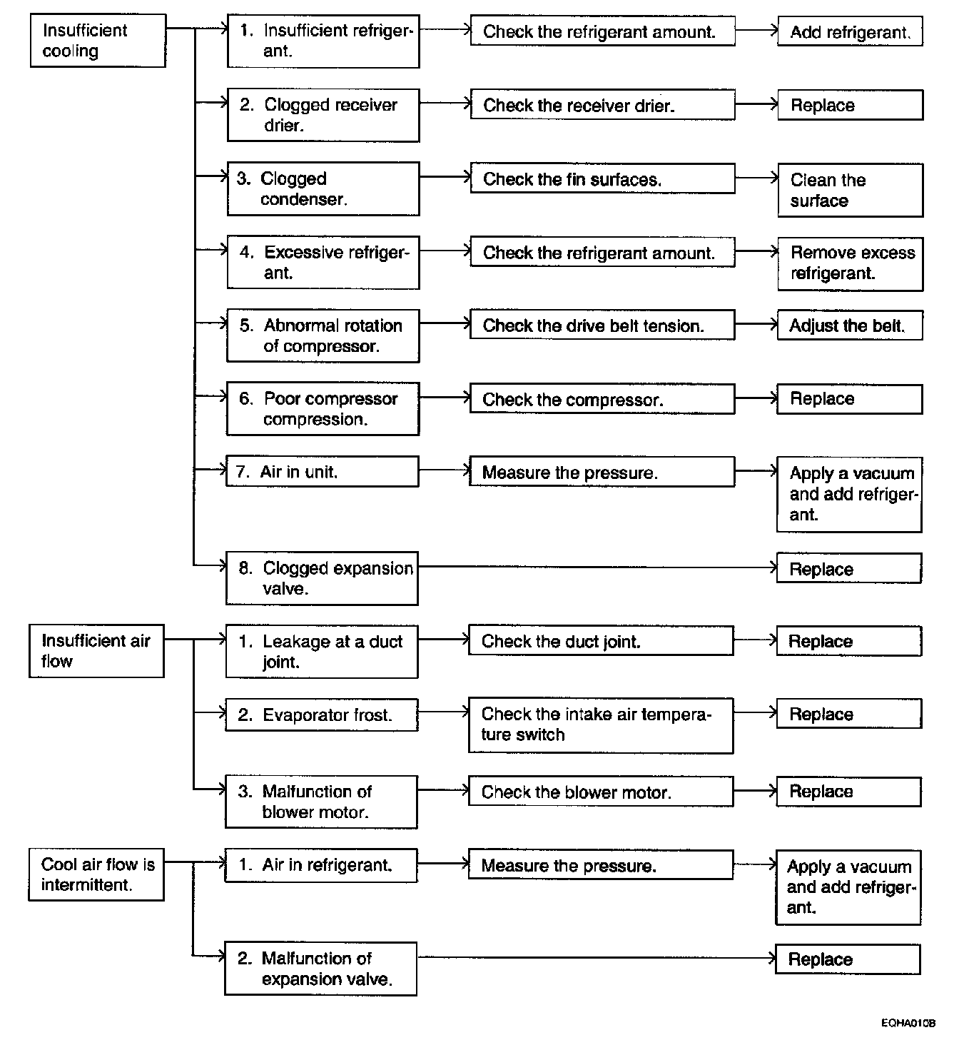 Before replacing or repairing air conditioning components, first determine if the malfunction is due to the refrigerant charge, air flow or compressor. The following diagnostic charts have been developed as a quick reference for determining the cause of the malfunction. If these charts do not satisfactorily describe the problem, refer to the appropriate for a more detailed explanation. After correcting the malfunction, check the complete system to ensure that performance is satisfactory.Part 1: