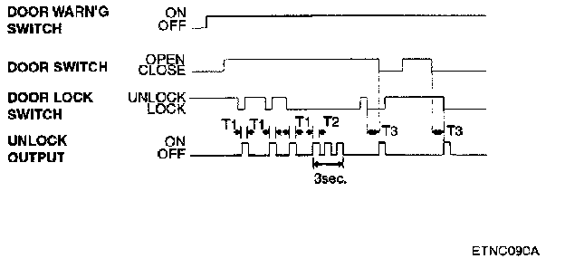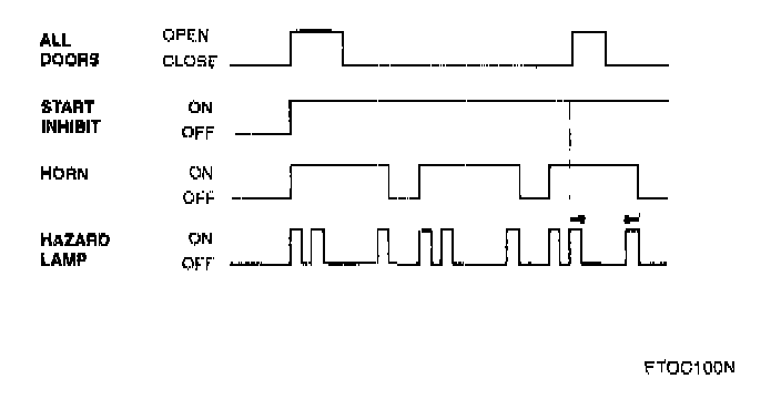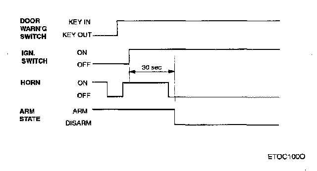 The alarm is given in the case where a door is opened with a key After this time, the system maintains the start inhibit state, where no audible and visual warnings are issued but engine starting is not possible.
