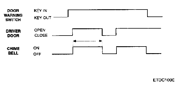 If the key is in ignition key cylinder and the drivers door is opened, the chime bell sounds. This tone is the same as the seatbelt warning chime and over speed warning chime. The chime sound is generated with a 800 Hz drive, amplitude modulated with an exponentially decaying envelope of Lime constant 1±0.25 seconds. If the door is closed or the key is removed, the chime stops immediately.