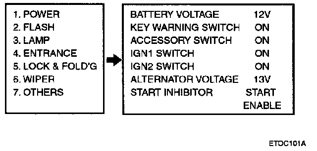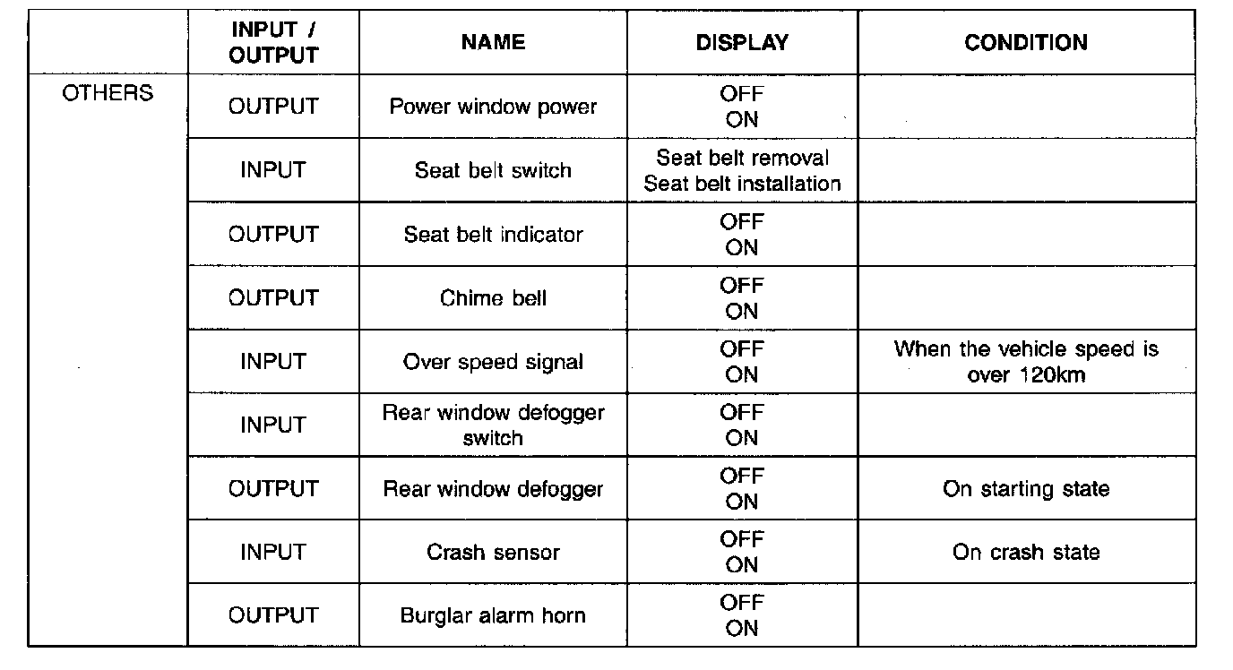 The components which is on and off as like turn signal lamp, seat belt indicator, burglar alarm horn, chime bell and front wiper relay are displayed "ON" while controlling.