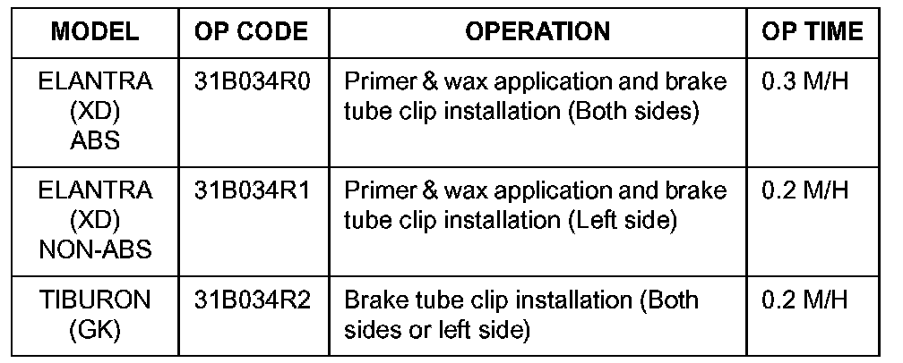 2. Elantra vehicles not equipped with ABS: Treat the left side (one) rear brake tube contact area with zinc spray and anti-corrosion wax; then install a white color brake tube clip at the left side contact area (refer to service procedure - B).