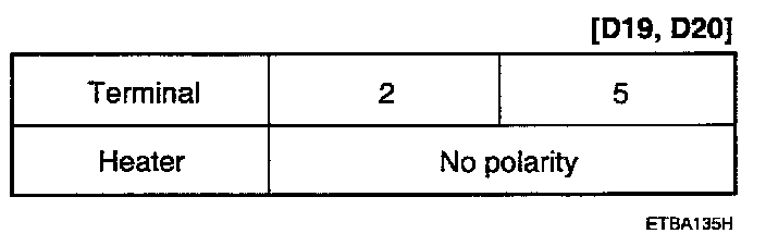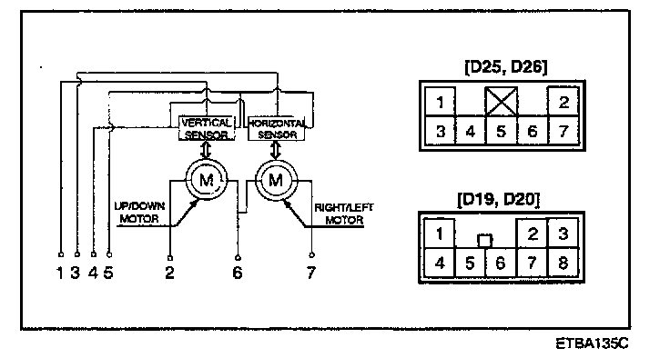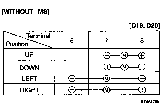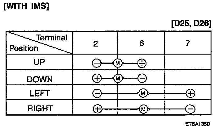 Apply battery voltage to each terminal as shown in the table and verify that the mirror operates properly.