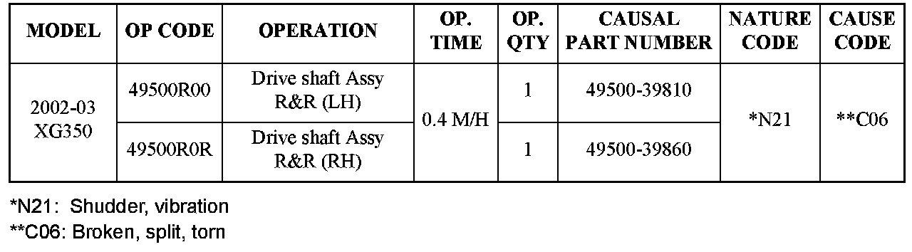 Some 2002-03 MY XG350 vehicles may experience a light to moderate shudder or vibration, which can be felt in the vehicle body, floor pan or accelerator pedal. The shudder or vibration may be felt during the following conditions: