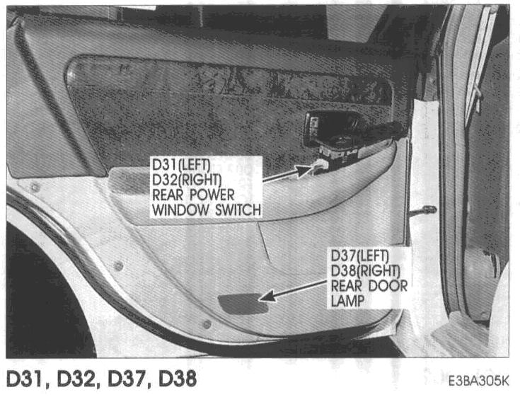 D31 Left Rear Power Window Switch, D32 Right Rear Power Window Switch, D37 Left Rear Door Lamp, D38 Right Rear Door Lamp: