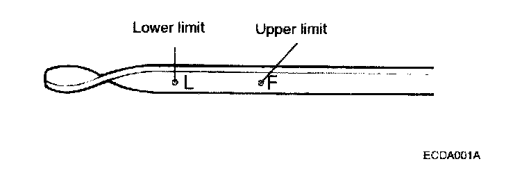 4. Check that the engine oil level is within the level range indicated on the oil dipstick If the oil level is found to have fallen to the lower limit (the L mark), refill to the "F" mark.