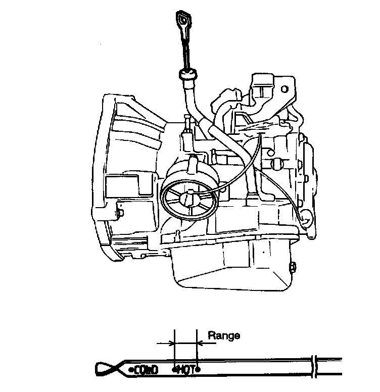4. Before removing the dipstick, wipe all contaminants from around the dipstick. Then take out the dipstick and check the condition of the fluid. The transaxle should be overhauled under the following conditions.
