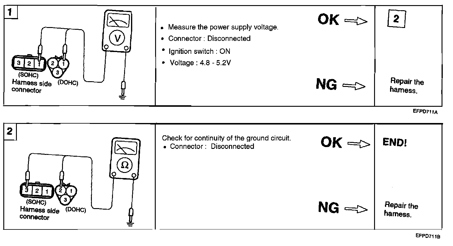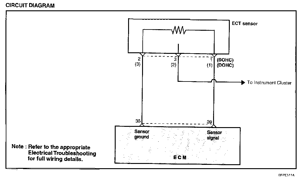 The engine coolant temperature sensor is located in the engine coolant passage of the cylinder head. It detects the engine coolant temperature and relays signals to the ECM. It employs a thermistor which is sensitive to changes in temperature. The electric resistance of a thermistor decreases in response to temperature increase. The ECM judges engine coolant temperature by the sensor output voltage and provides optimum fuel enrichment when the engine is cold.