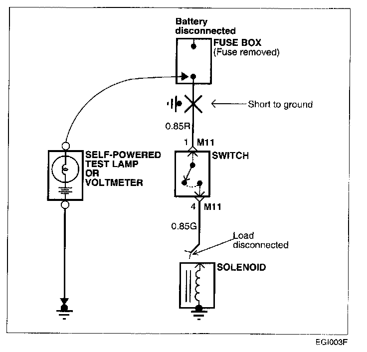 e. When the self-powered test lamp glows, or ohmmeter registers, there is a short to a ground in the wiring near that point.
