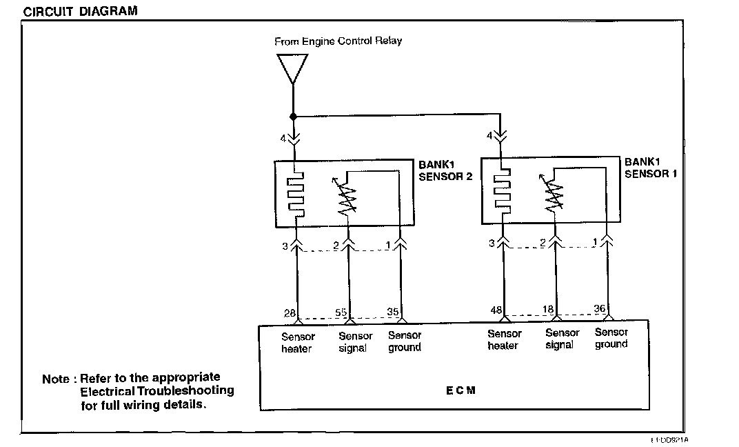 The heated oxygen sensor senses the oxygen concentration in the exhaust gas, then converts it into a voltage and then sends this to the ECM. The heated oxygen sensor gives an output of about 800 mV when the air fuel ratio is richer than the theoretical ratio and output of about 100 mV when the ratio is leaner (higher oxygen concentration in exhaust gas.) The ECM controls fuel injection based on this signal so that the air fuel ratio is maintained at the theoretical ratio.