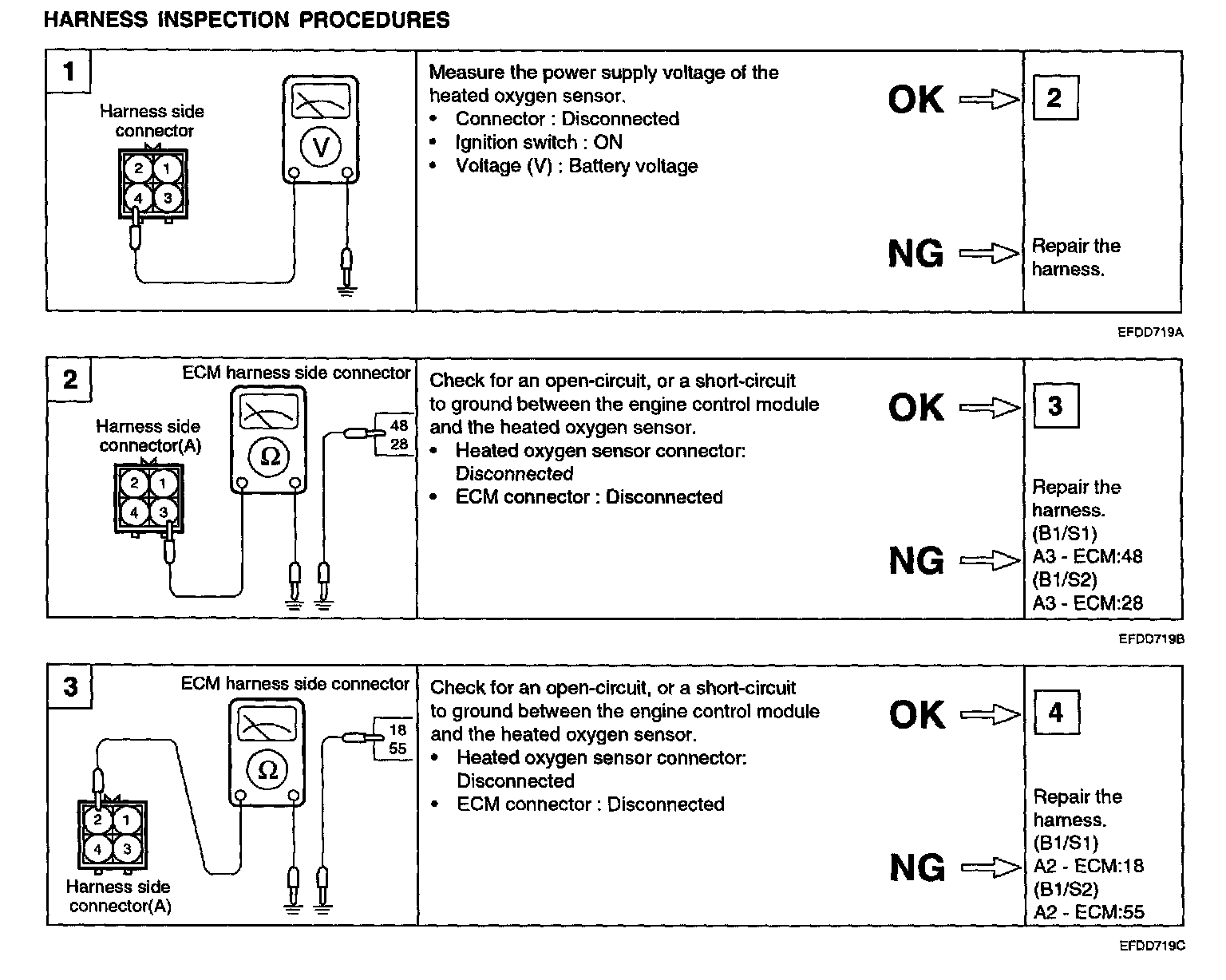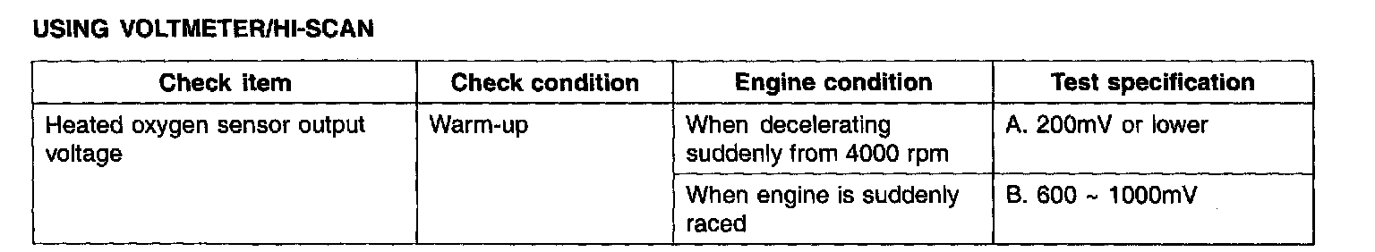 NOTE: If you release the accelerator pedal suddenly after engine running about 4000 rpm, fuel supply will stop for short period and the O2 sensor service data in the HI-SCAN will display values in the A range. When you suddenly press on the accelerator pedal down, the voltage will reach B range. When you let the engine idle again, the voltage will fluctuate between ranges A and B. In this case, the O2 sensor can be determined as good.