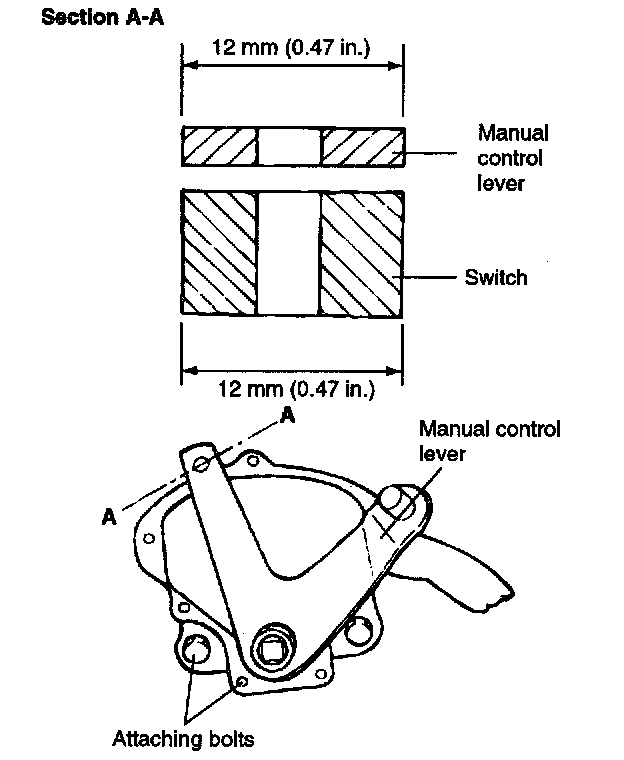 4. Turn the transaxle range switch body until the 12 mm (0.47 inch) wide end of the manual control lever aligns with the switch body flange [12 mm (0.472 inch) wide portion].
