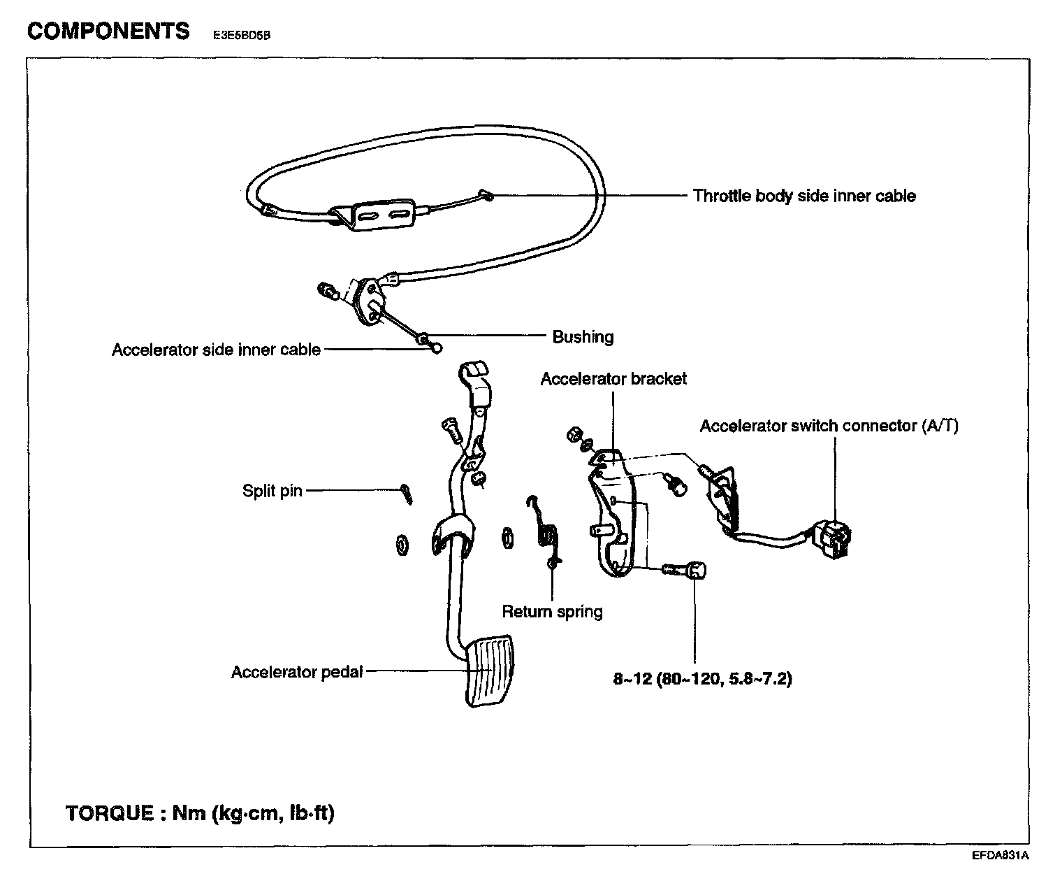 Accelerator arm bracket bolts: 8 - 12 Nm (80 - 120 kg.cm, 5.8 - 7.2 lb.ft)