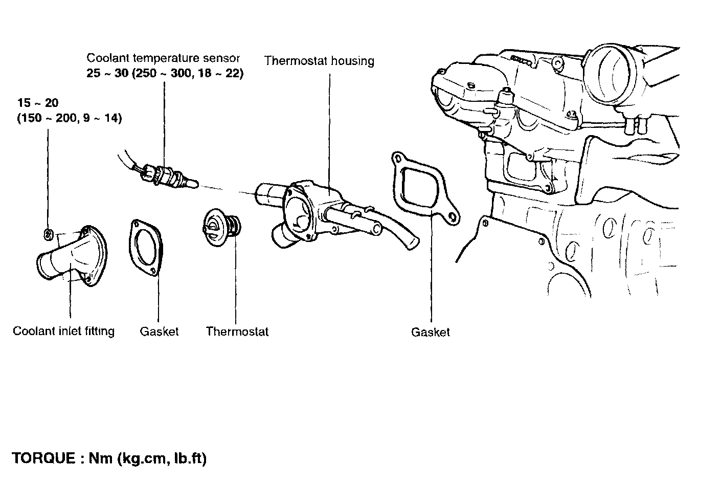 Thermostat housing bolt 15-20 Nm (150-200 kg-cm, 11-15 ft. lbs.)
