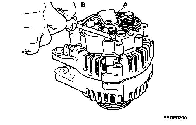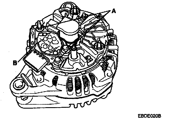 2. Loosen the mounting bolts(A) and disconnect the brush holder assembly(B).