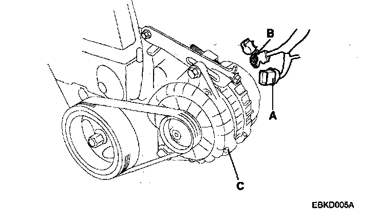 2. Disconnect the generator connector(A) and "B" terminal cable(B) from the generator(C).