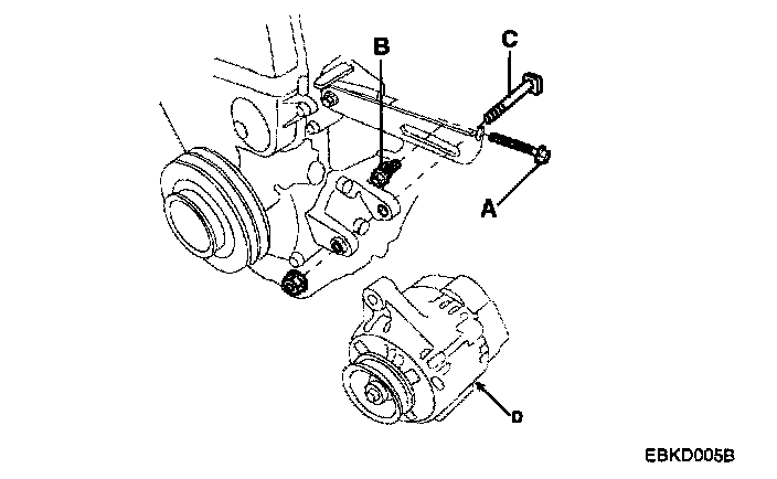 3. Remove the adjusting bolt(A) and mounting bolt(B), then remove the generator belt(C).