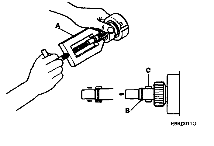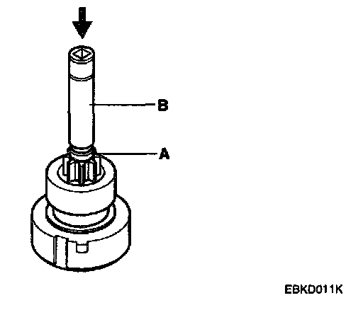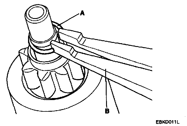 NOTE: Using a suitable pulling tool (A), pull the overrunning clutch stop ring(B) over the stopper(C).