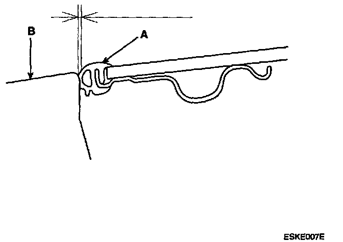 6. Check for overlap between the sunroof weatherstrip (A) and the roof panel (B).