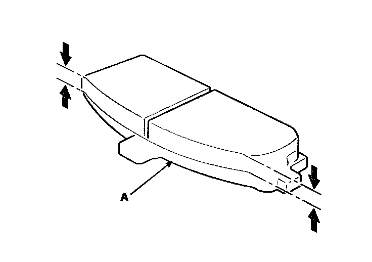 5. Using vernier calipers, measure the thickness of each brake pad lining. The measurement does not include pad backing plate (A) thickness.