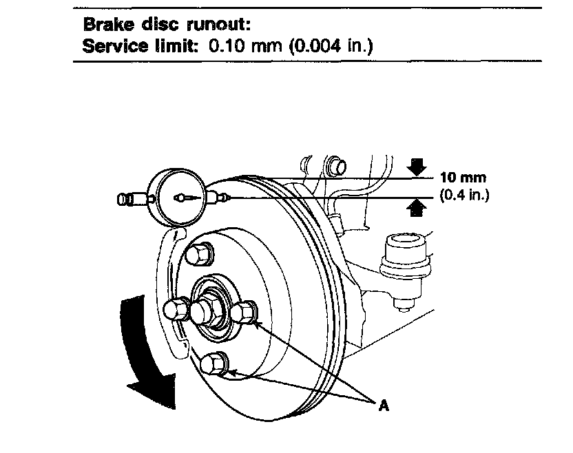 4. Use wheel nuts and suitable flat washers (A) to hold the disc securely against the hub, then mount a dial indicator as shown, and measure the runout at 10 mm (0.4 inch) from the outer edge of the disc.