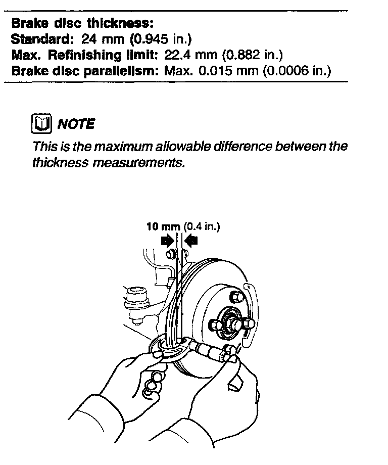 3. Using measure disc thickness at eight points, approximately 45° apart and 10 mm (0.4 inch) in from the outer edge of the disc. Replace the brake disc of the smallest measurement is less than the max. refinishing limit.