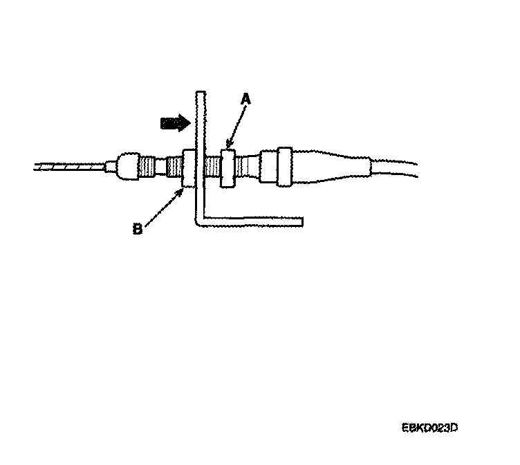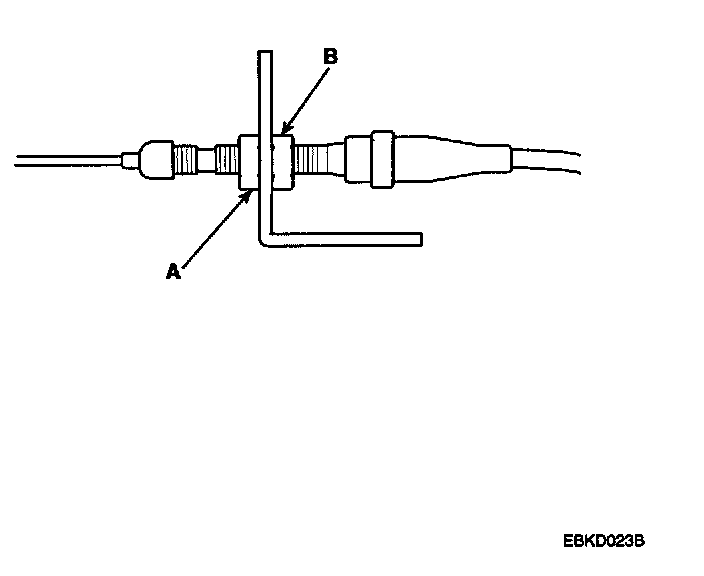 6. Pull the cable assembly so that the adjusting nut (A) touches the bracket, and tighten the locknut (B).