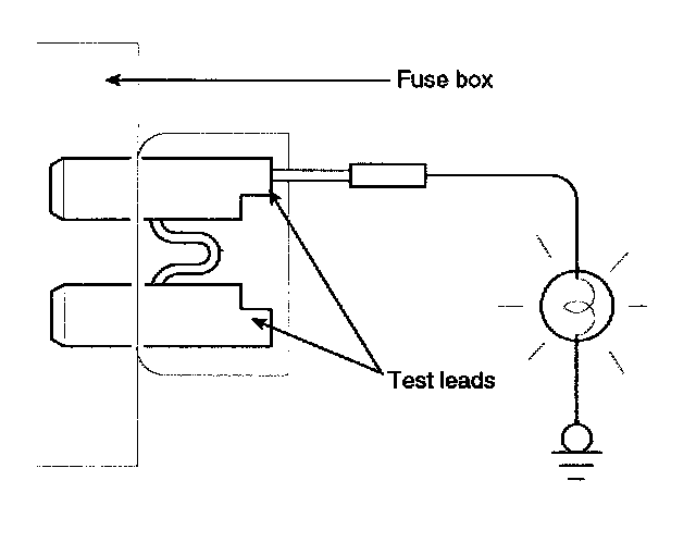 A blade type fuse test leads provided to allow checking the fuse itself without removing it from the fuse box. The fuse is good if the test lamp lights up when one lead is connected to the test leads (one at a time) and the other lead is grounded. (Turn on the ignition switch so that the fuse circuit becomes operative)