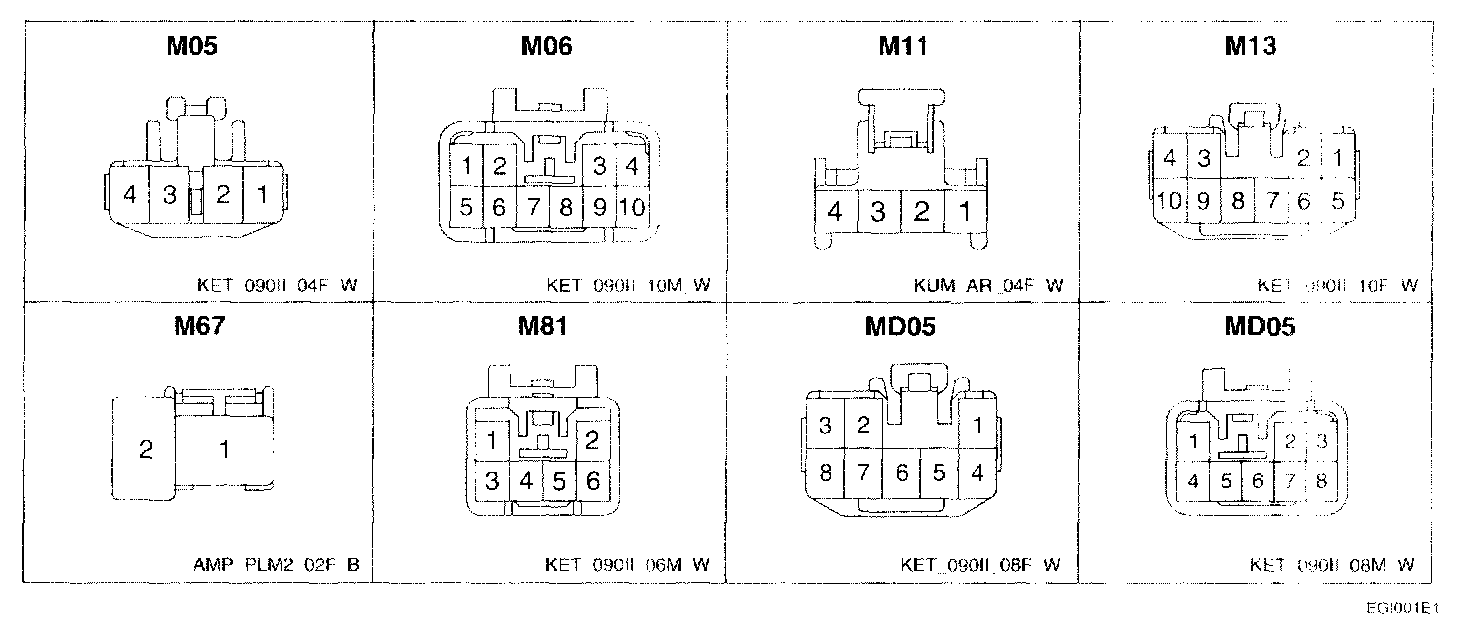 This shows the cavity or terminal locations in all the multi-pin connectors shown in the schematic diagrams. It will help you to locate check points together with the wire colors and terminal numbers in the schematic. The configuration drawings show the connector view as seen from a component after the harness connector has been disconnected. When more than one connector is connected to a component, the connectors are all shown together. Both halves of in-line connectors are shown together.