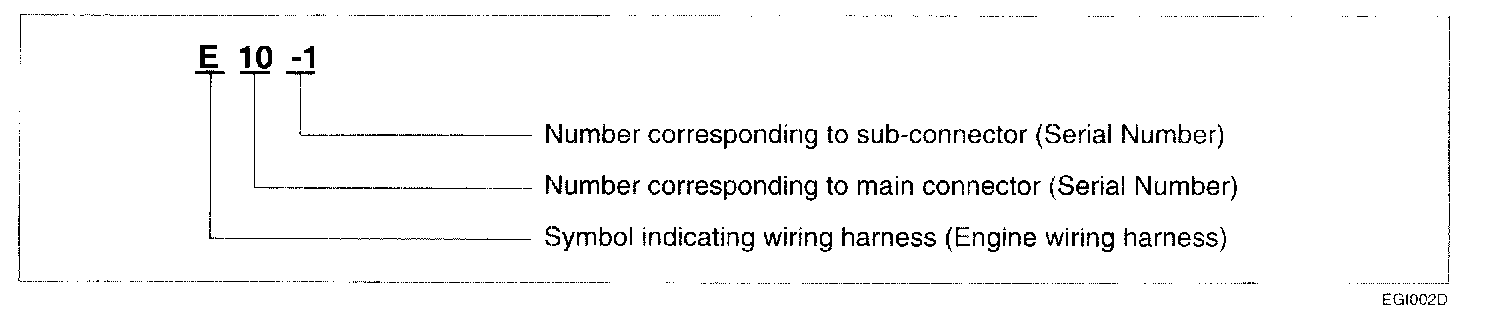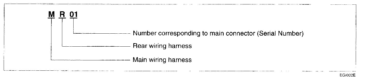 A connector identification symbol consists of a wiring harness location classification symbol corresponding to a wiring harness location and number corresponding to the connector. These connector locations can be found in the HARNESS LAYOUTS.
