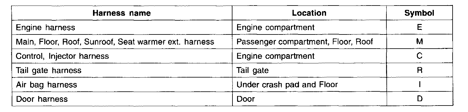 Electrical wiring connectors are classified according to the wiring parts in the Harness Layouts.