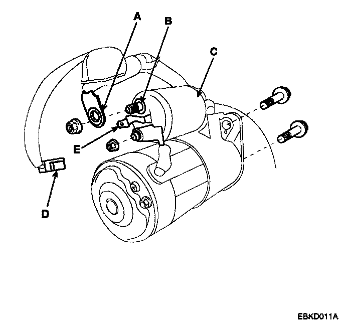 2. Disconnect the starter cable (A) from the B terminal (B) on the solenoid (C), then disconnect the connector (D) from the S terminal (E).