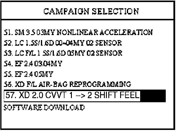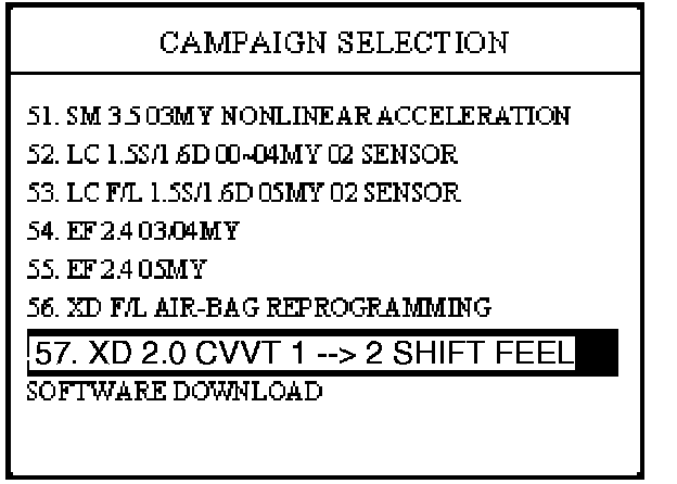 6. Select option "57. XD 2.0 CVVT 1-->2 SHIFT FEEL" and press ENTER.