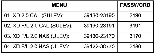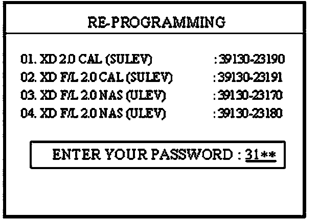 6. Select the correct password for the manual update mode which is correct for the vehicle specification by referring to the chart shown. Then press ENTER.