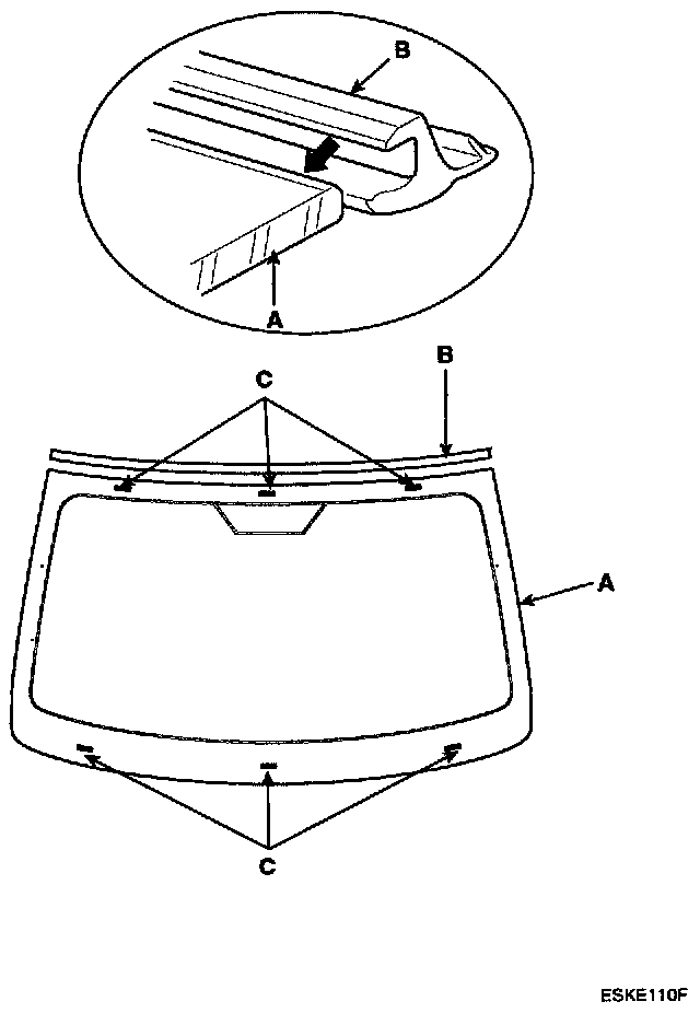 4. Install the windshield (A) upper molding (B) and fasteners (C). Do not allow any gaps.