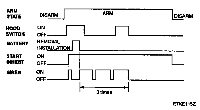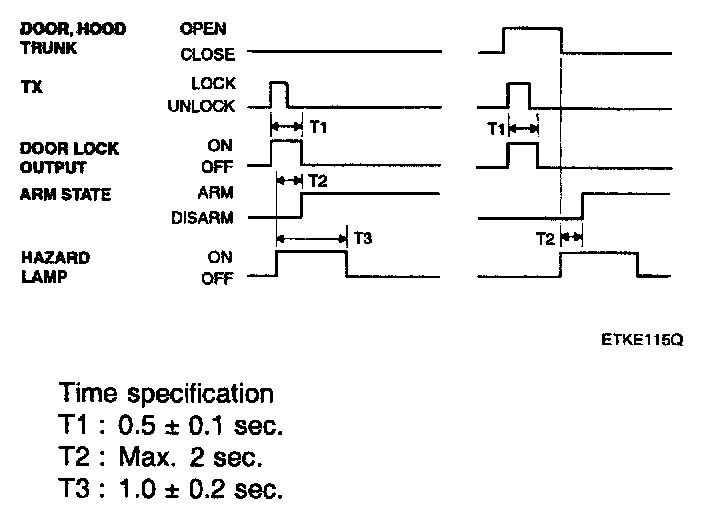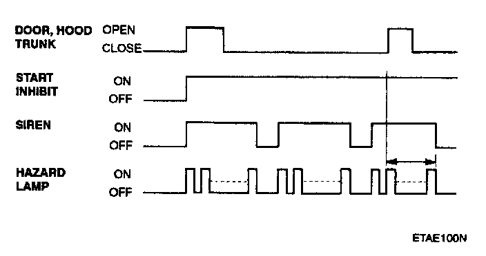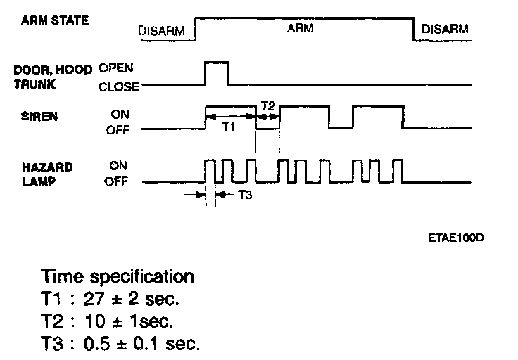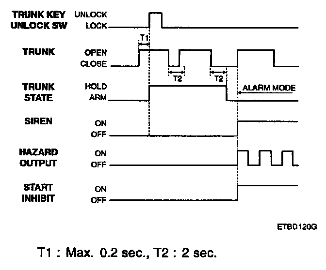 1. In case of opening the trunk by trunk unlock switch during arm state, the alarming is hold. When received transmitter (TX) trunk signal in arm state, trunk open by output trunk lid open relay signal for 500 ms and then holding alarm. But the door and hood except trunk is still in the arm state.