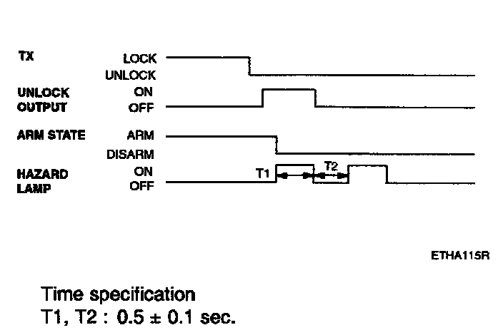 - Pressing the unlock button on the transmitter(TX) key. The hazard lamps shall be flashed twice for 1 sec period (of cycle), 50% duty rate.