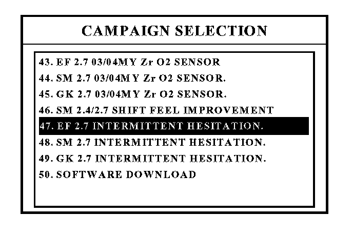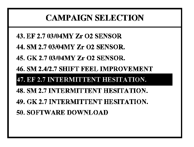 In the event menu option "01. EF 2.7 03~05MY INTERMITTENT [AUTO]" fails to download the new program, option "02. EF 2.7 03~05MY INTERMITTENT [ERROR]" must be used.