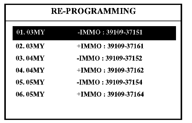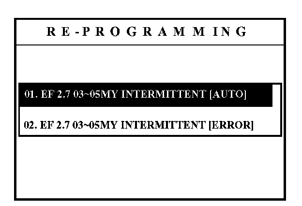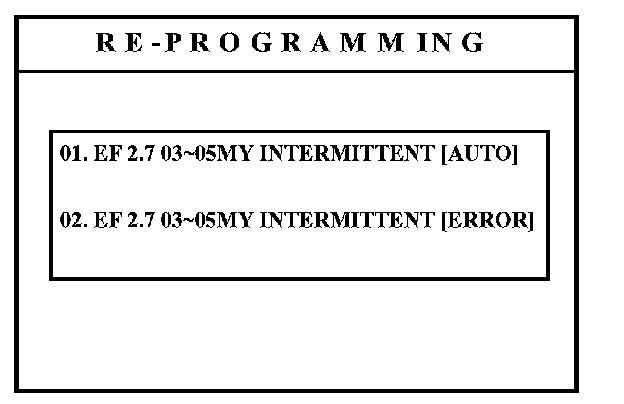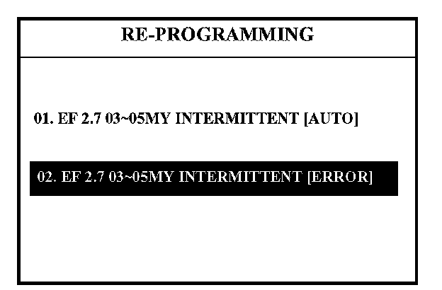5. "REPROGRAM ERROR PLEASE CHECK SYSTEM": In this case you must reprogram manually by selecting menu option "02. EF 2.7 03~05MY INTERMITTENT [ERROR]".